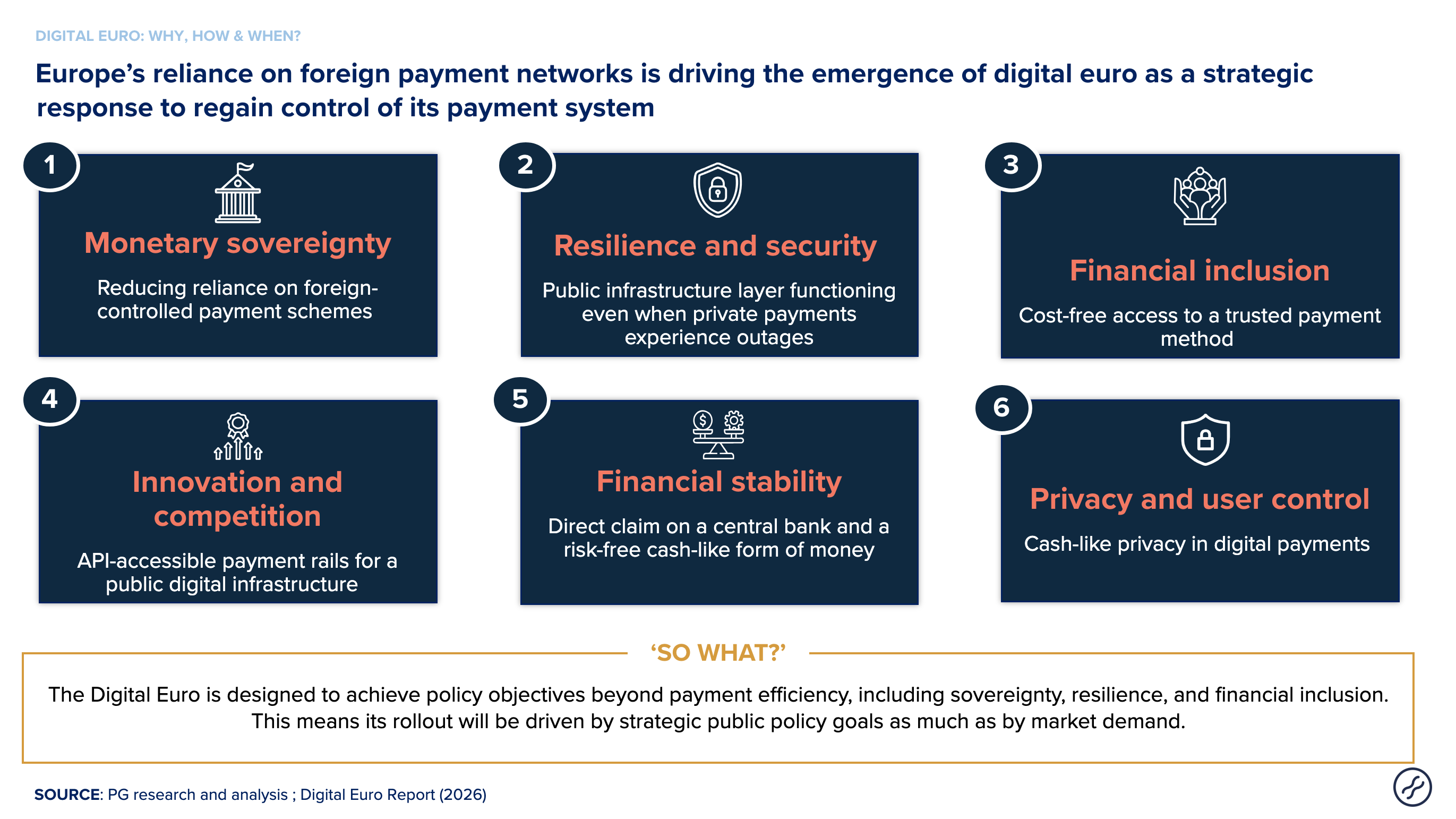 This distinction matters. Unlike cards or wallets that succeed based on user demand and commercial incentives, the Digital Euro will likely be pushed forward regardless of immediate adoption. As a result, its success depends on aligning three forces: public policy ambition, private-sector incentives, and consumer behaviour.