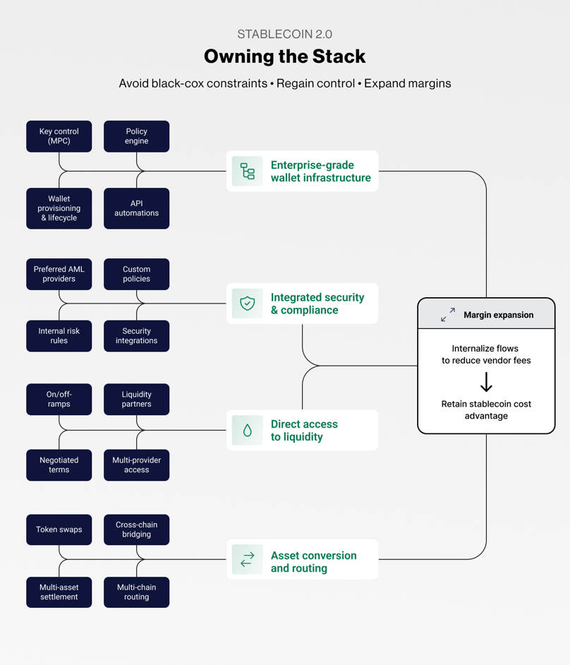 For most mid-sized PSPs and fintechs, four elements sit at the control boundary: wallet infrastructure (because it determines how you attribute funds, segregate client assets, and manage keys), compliance integration (because your regulatory obligations are yours regardless of who runs the screening), liquidity access (because your on/off-ramp relationships directly affect your unit economics), and asset conversion and routing (because your counterparties will not all use the same stablecoin on the same chain).