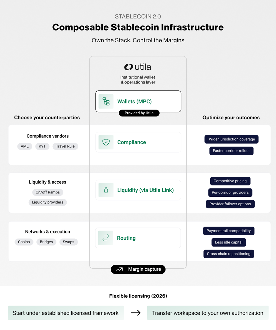 Bentzi: Utila sits at the wallet and operations layer of the stablecoin stack. We provide the infrastructure that institutions use to store, move, and govern digital assets — MPC-based key management, multi-chain wallet creation, policy enforcement, compliance screening, gas management, and the API layer that connects all of it to the institution's backend systems.
